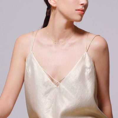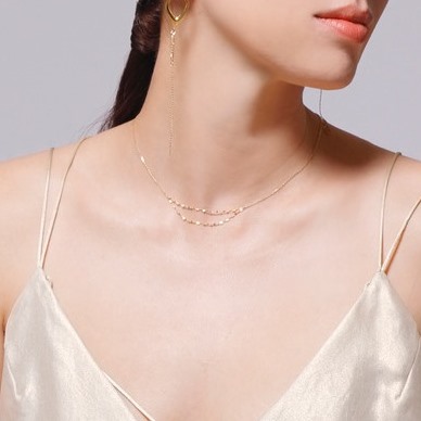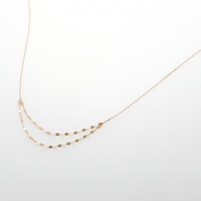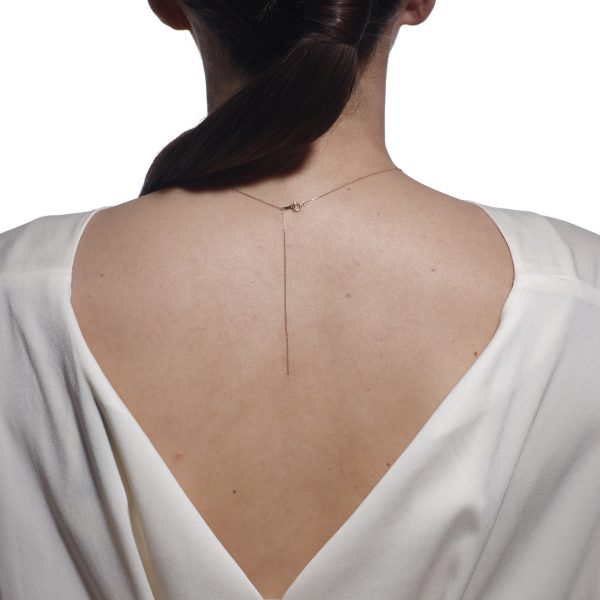 シャープな直線と身体のシルエットに沿って流れるような弧を描くチェーンとのコンビネーションが、静かな存在感を示すロングネックレス。ミニマルなスタイルに華やかさをプラスしてくれます。